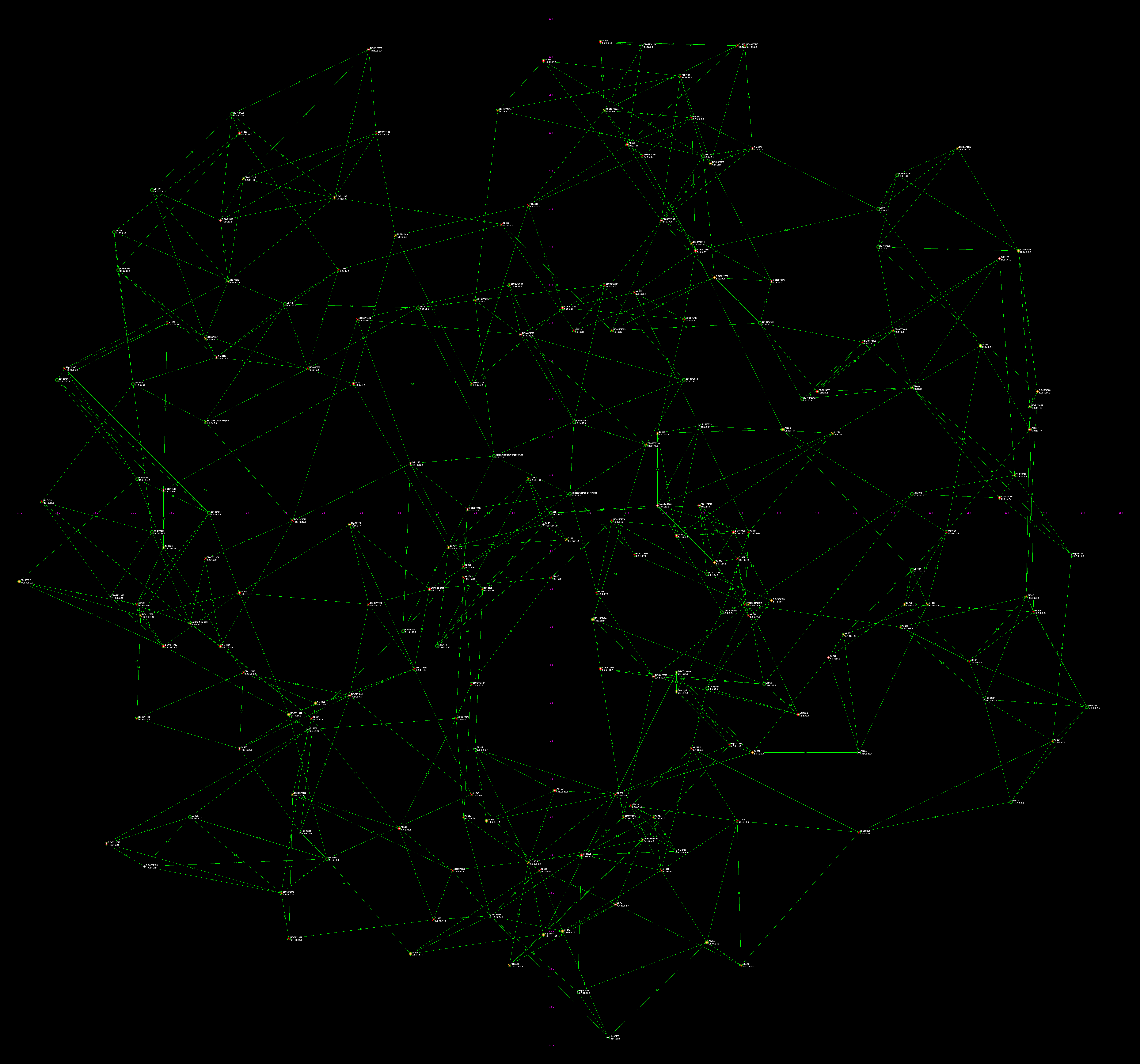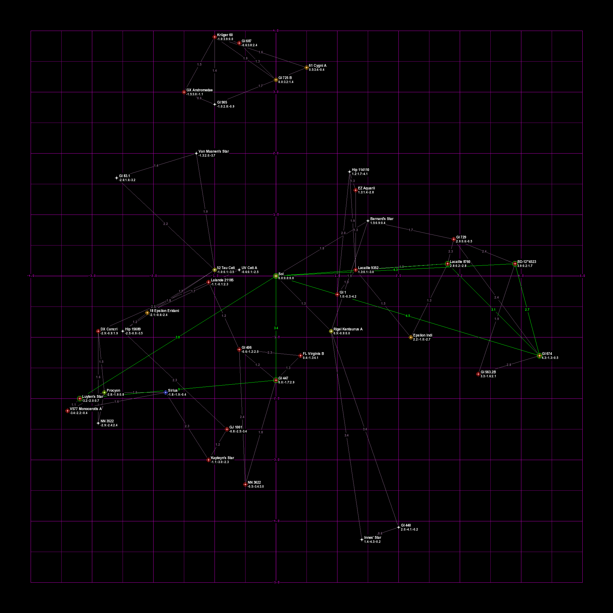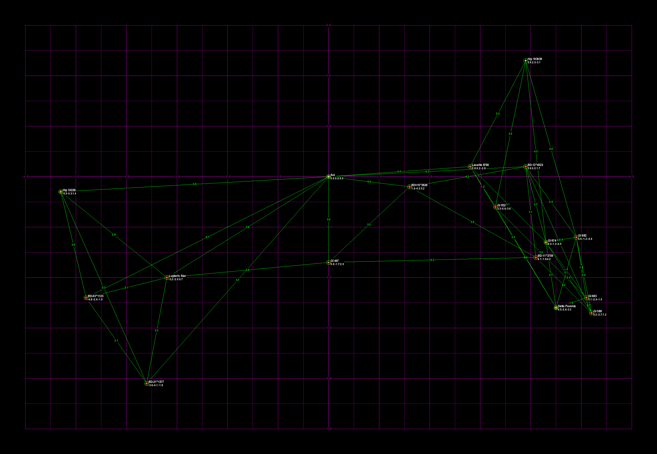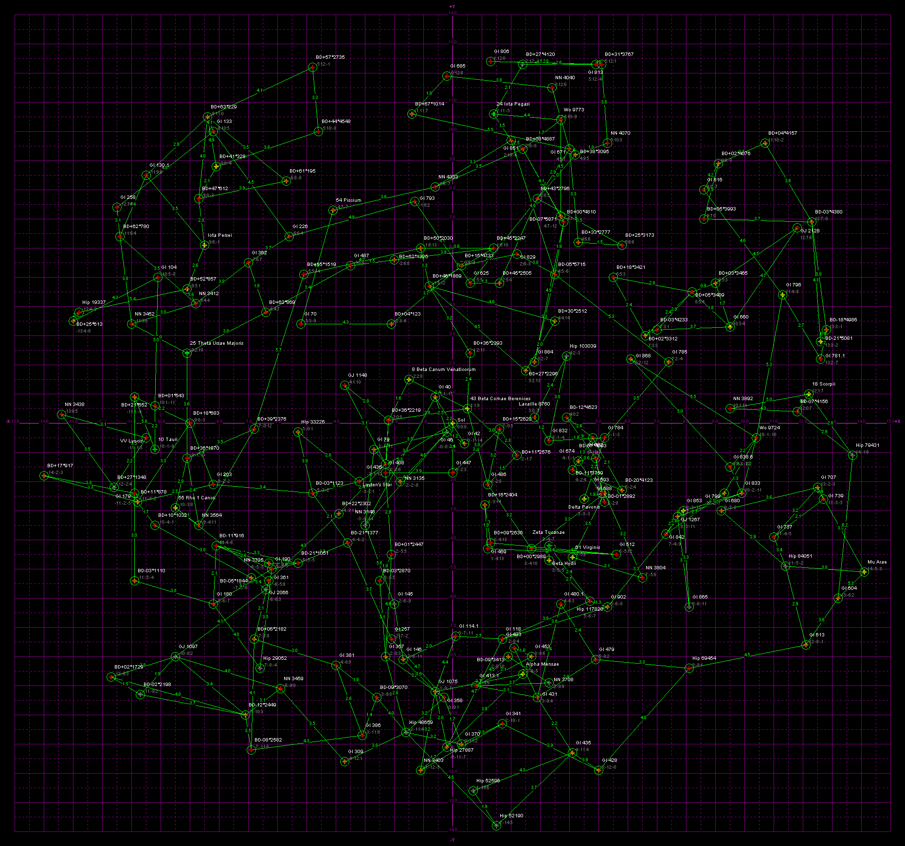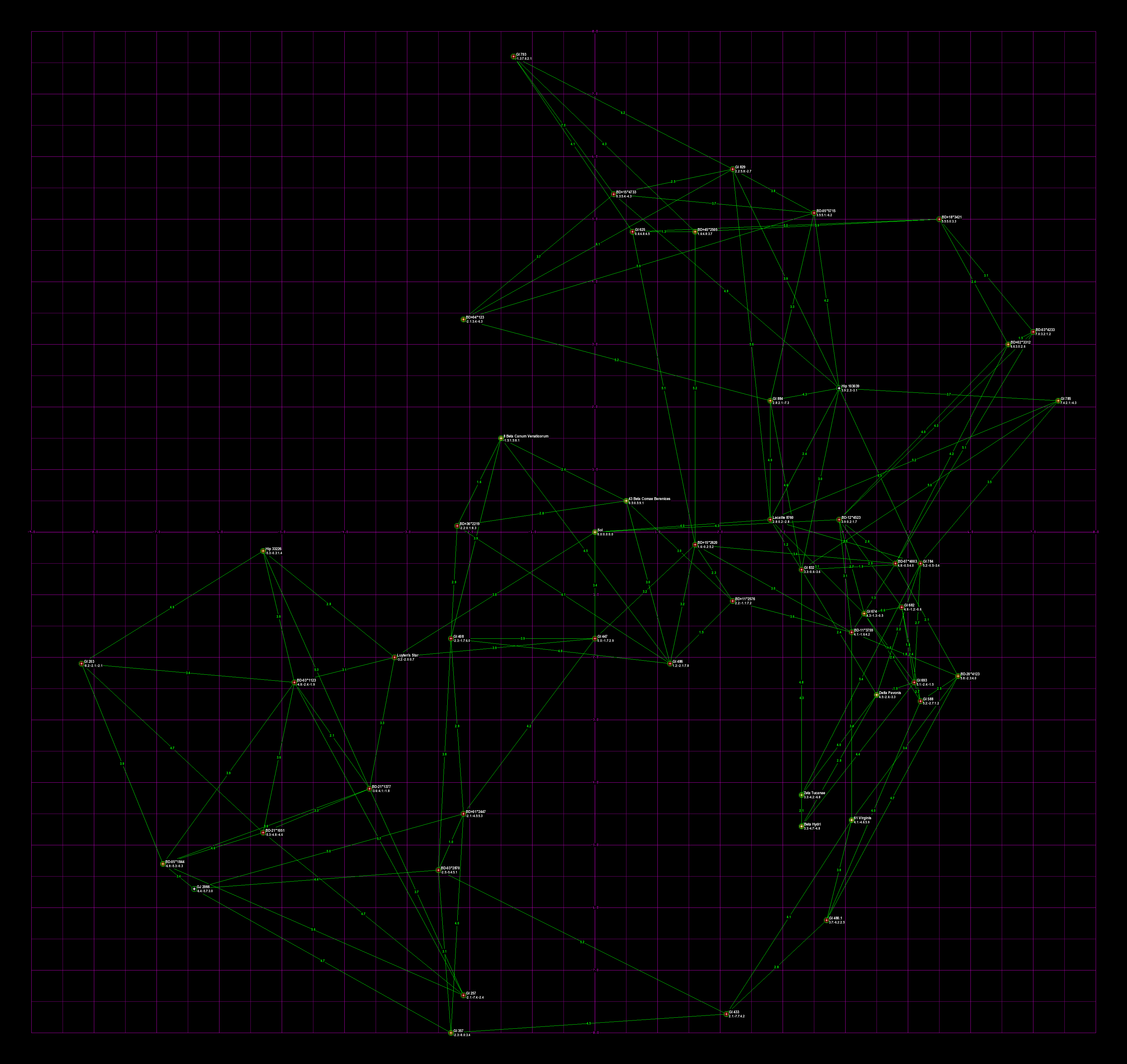 Violet lines are drawn between each star and its two closest neighbors, and the lines are labeled with the distance. In addition, HabCat stars have green lines to their two closest HabCat stars.