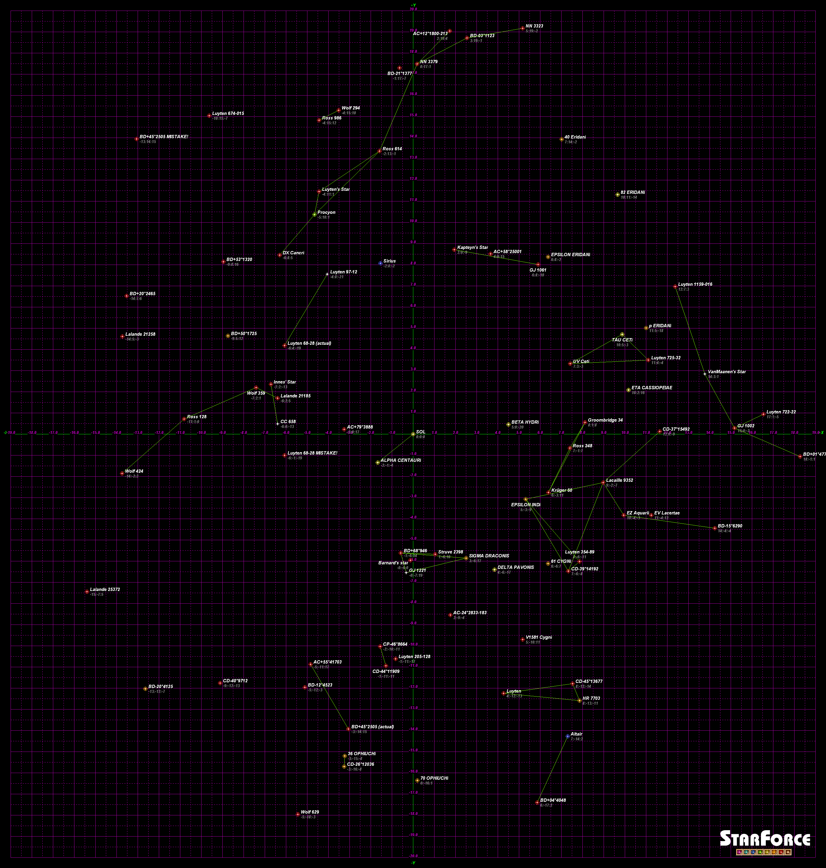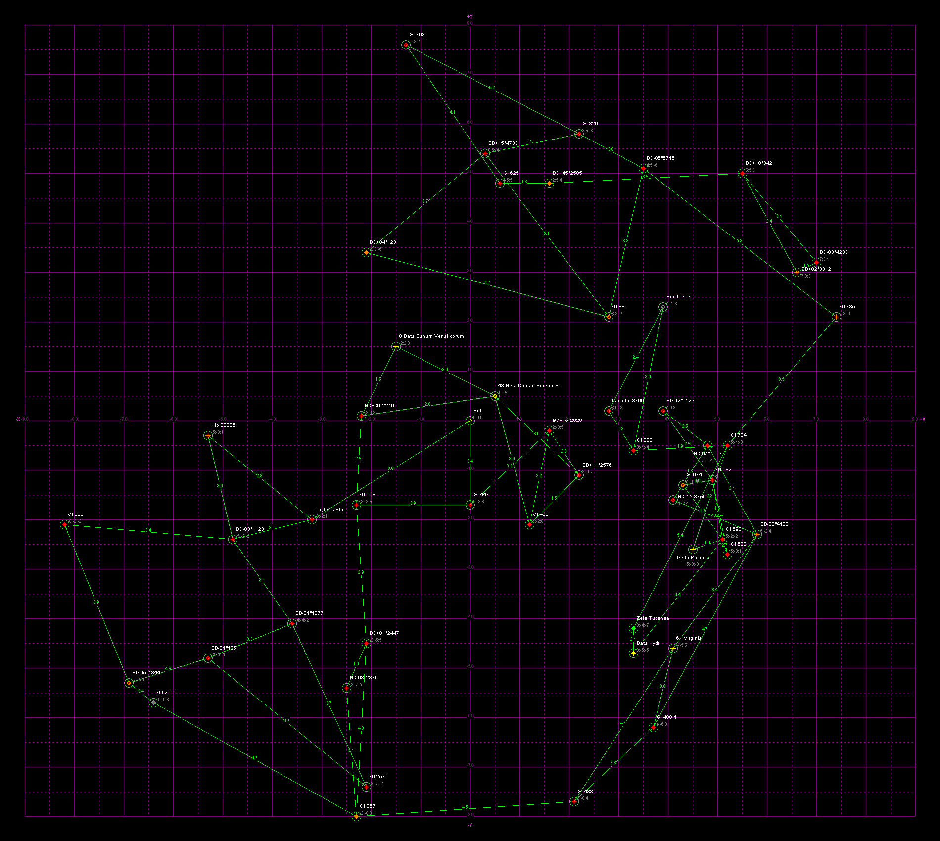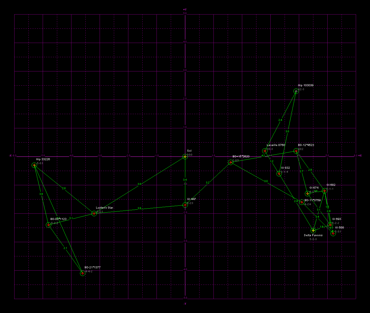 Galactic co-ords, galactic core is in the direction of the +X axis, -X is rimward, +Y is spinward, and -Y is trailing. All units are in parsecs (again: multiply parsecs by 3.26 to get light-years). Stars likely to possess habitable planets are circled in green. Each habitable star has green lines linking them with the closest two habitable stars. Line are labeled with the distance in parsecs. On the maps with non-habitable stars, in addition each non-habitable star has purple lines linking them with the closest two stars. These lines are just to give one a feel for a star's neighbors. If all the lines were drawn the map would resemble a cobweb made by a spider on LSD.