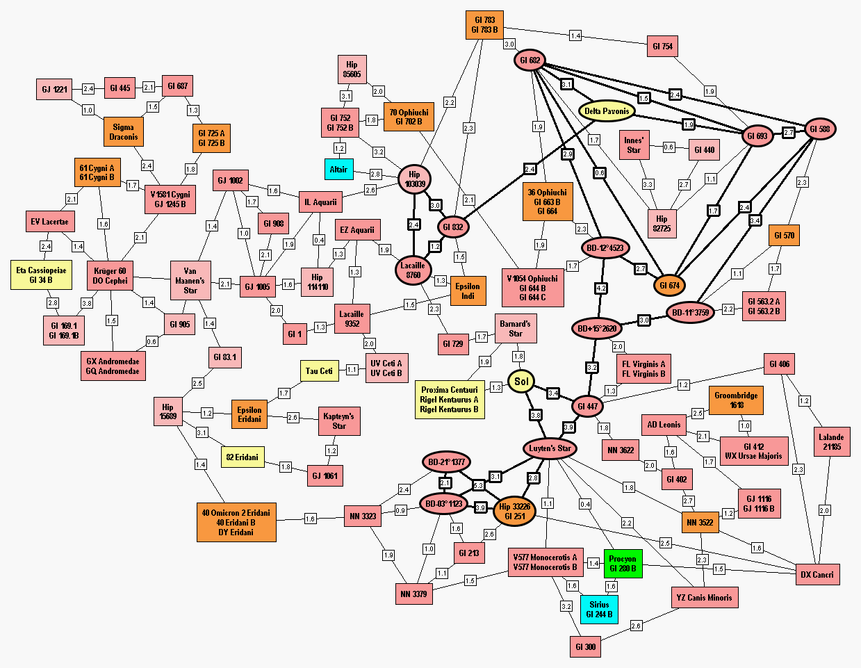Dotted lines are drawn between each star and its two closest neighbors, and the lines are labeled with the distance. In addition, HabCat stars have lines to their two closest HabCat stars.
