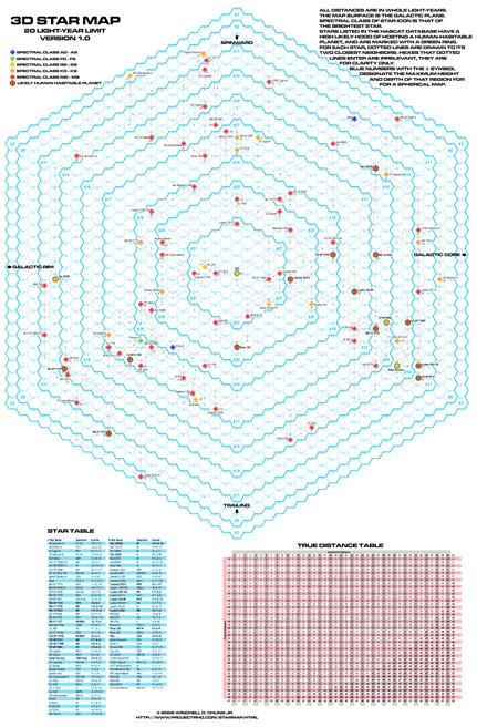 Map Poster #1: 30 Light YearsFull Size 23” X 35” Small Size16” X 20” The first is a map of all known stars within 30 light-years of the Sun. This map is intended for SF authors plotting out their SF universes. The map comes in a full sized 23" x 35" poster, a small size 16” X 20” poster. The small size poster lacks the tables. It is a Cartesian plot with the x-y plane parallel to the plane of the galaxy. The positive X-axis points at the galactic center ("Coreward"), the negative X-axis points at the galactic rim ("Rimward"), the positive Y-axis points in the direction of galactic rotation ("Spinward"), the negative Y-axis points opposite to the galactic rotation ("Trailing"). Distances are in light-years. Stars are indicated by an icon color coded to the spectral class of the star (or the brightest star if it is a multiple star system). Stars listed in the HabCat database have a high probability of possessing a human habitable planet and are marked with a green ring. |
