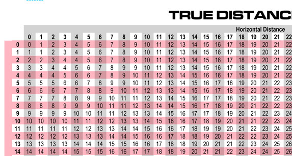 To the right is a True Distance table, used to calculate the actual three dimensional distance between any two points. Cross reference the horizontal distance between the two points in hexagons with the vertical distance on the table to find the actual distance. Distances too far to fit inside the spherical bounds of the map are marked in bold print.