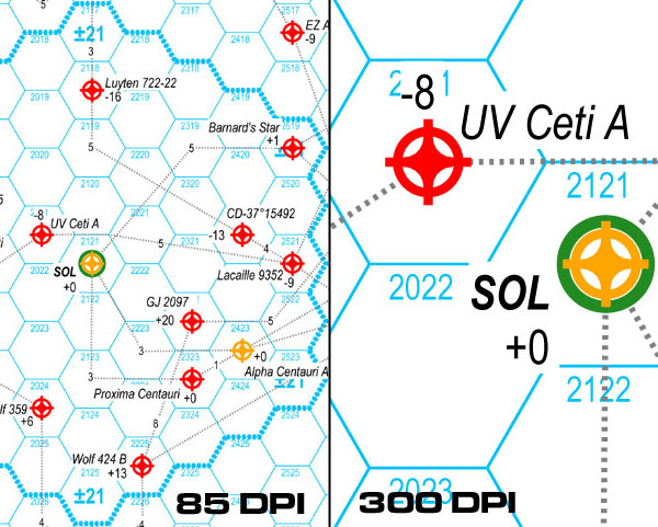 Map Poster #2: 20 Light Year Hex MapFull Size 23” X 35” Small Size 16” X 20” This is a map of all known stars within 20 light-years of the Sun. The map is plotted on a hex grid, suitable for playing war games. The map is similar to the one found in the out-of-print wargame StarForce. The map comes in a full sized 23" x 35" poster, and a small size 16” X 20” poster. The hexes on the full size map are large enough to accommodate a standard wargame playing counter. The other has hexes that are too small, but can be used as campaign planning maps. Distances are in light-years. Each hexagon is one light-year in diameter. The map is spherical, so the various ring-shaped regions are labeled with the maximum height or depth values that will still be within the spherical boarder. Stars are indicated by an icon color coded to the spectral class of the star (or the brightest star if it is a multiple star system). Stars listed in the HabCat database have a high probability of possessing a human habitable planet and are marked with a green ring. |