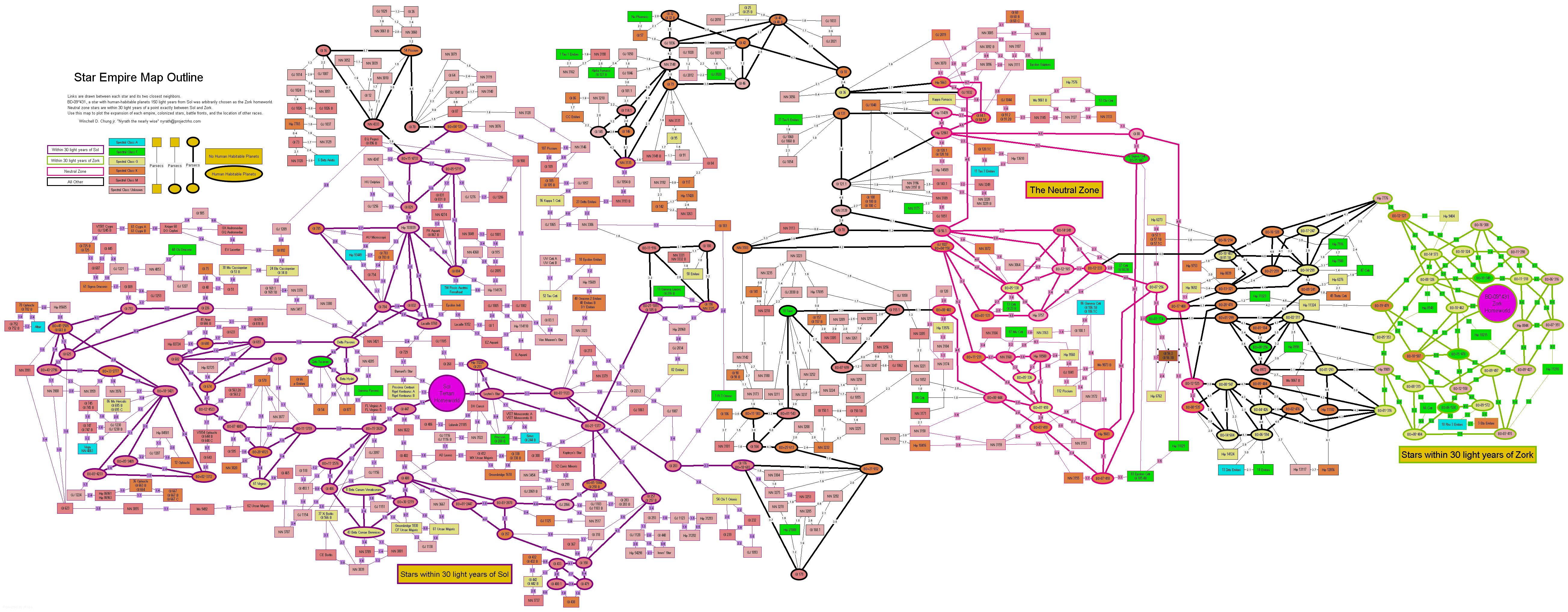 The 60 light-year diameter spheres will be the "spheres of influence" of Sol and Zork. Another 60 ly diameter sphere centered on the midpoint will be the Neutral Zone. The idea is that the intrepid empire builder will decide which stars have been explored, which have mining colonies, which are colonized, and which are officially part of the empire. Once the enemy has been discovered, the neutral zone will alternate between being a demilitarized zone and the main battle line. As previously mentioned, this will be populated by spies, smugglers, covert battlefleets intent on causing boarder incidents, and planets named "Casablanca".
