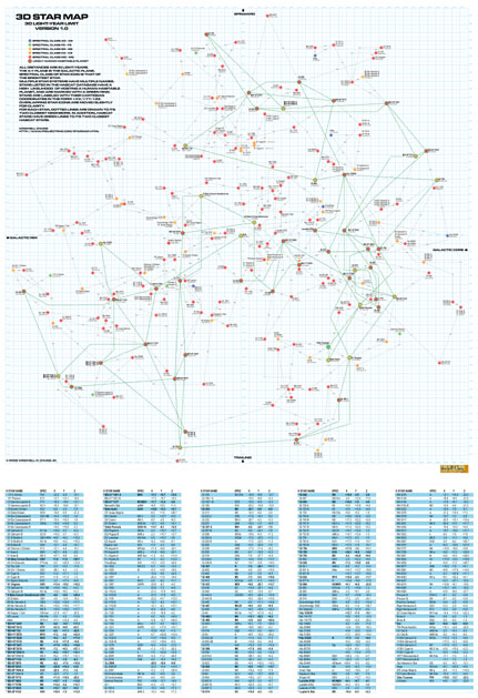 In the bottom part of the poster is a table of all the stars on the map. The table includes the star name, HabCat status, spectral class, and Cartesian coordinates. On the right side is a simple map of the galaxy, to provide orientation.