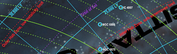 The star spreadsheets are in comma separated format. Column one is the HabHYG index number. Column two is the Hipparcos catalog number. Column three is the habitability flag, 1 = star has a high probability of hosting a human habitable planet (i.e., it is listed in the HabCat database). Column four is the name displayed on the map (i.e., the most colorful name out of all the possibilities, in my opinion). Column five is the HYG catalog number. Column six is the Bayer-Flamsteed name. Numbers and greek letters are alternate prefixes (e.g., "18 Epsilon Eridani" can be called either "18 Eridani" or "Epsilon Eridani"). Column seven is the Gliese catalog number. Column eight is Bonner Durchmunsterung catalog number (used by James Blish in his "Cities in Flight" novels). Column nine is the Henry Draper catalog number. Column ten is the Hoffleit Bright Star catalog number. Column eleven is the star's proper name, if any. Column twelve is the star's spectral class. Column thirteen is the star's distance from Sol in parsecs. Column fourteen through sixteen is the star's xyz galactic cartesian co-ordinates in parsecs (used to draw the maps). And column seventeen is the star's absolute magnitude.